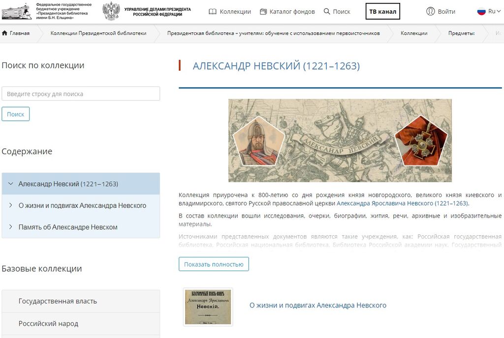 Рис. 1. Коллекция «Александр Невский (1221–1263)» на портале Президентской библиотеки