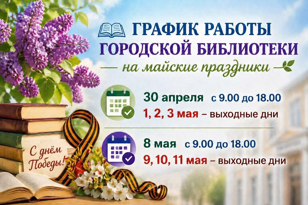 Уважаемые читатели! Обращаем ваше внимание на график работы библиотек в праздничные дни. 30 апреля и 8 мая все библиотеки МО Заречного работают на 1 час короче. 1-3 мая, 9-11 мая выходные дни.